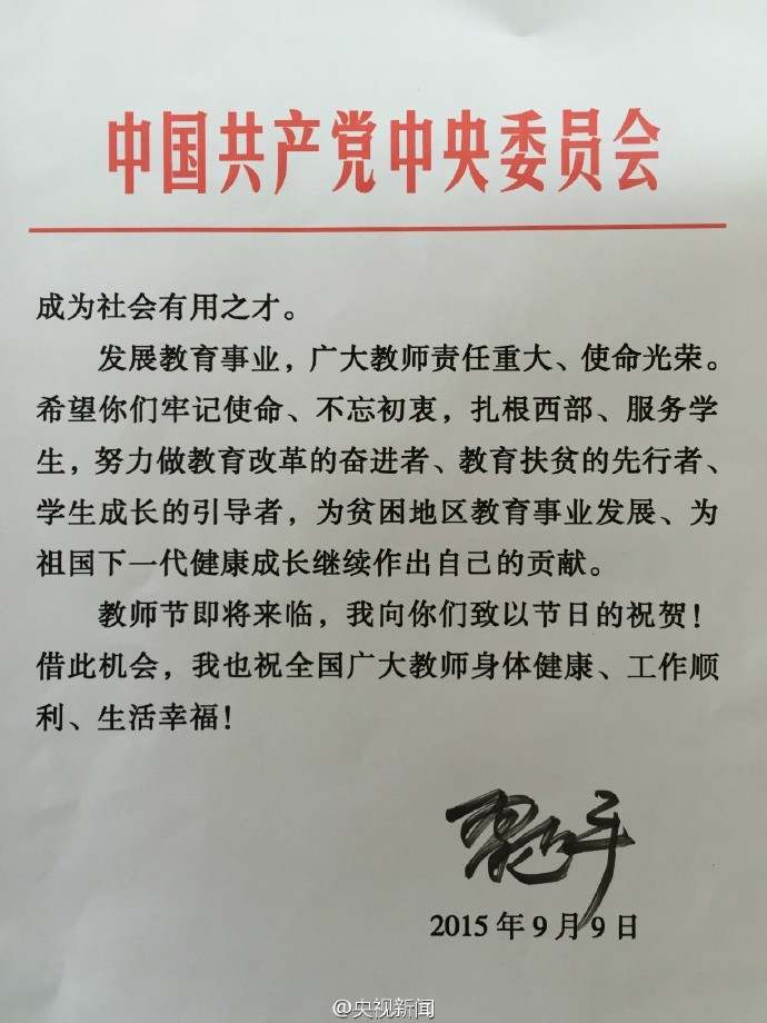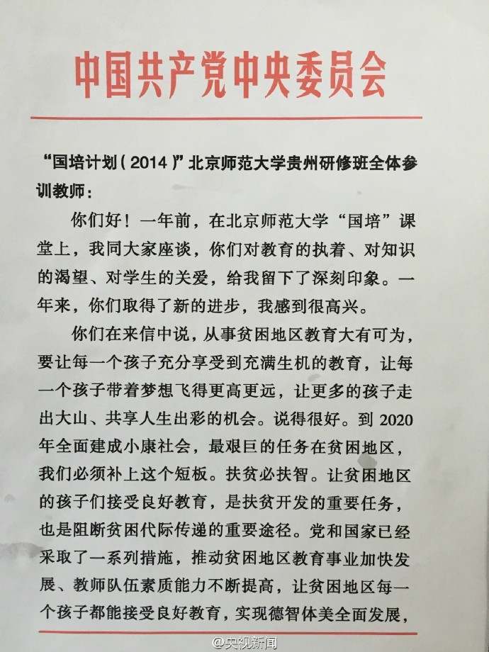 2015年9月9日,习近平总书记给“国培计划(2014)”北京师范大学贵州研修班全体参训教师回信。(央视)