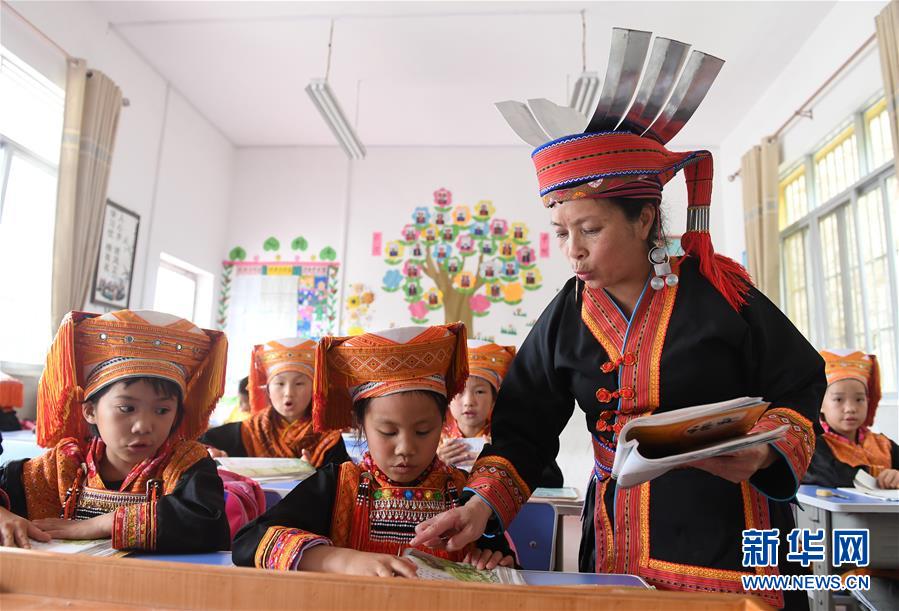 在广西金秀瑶族自治县忠良乡山界教学点,教师陶凤英在辅导学生学习(6月4日摄)。 新华社记者 陆波岸 摄