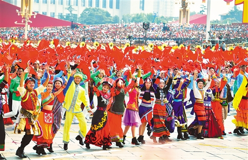 ——新中国是金色的。“蔚蓝的天空下涌动着金色的麦浪”,收获的喜悦与优美的旋律相映生辉。群众游行队伍沐浴着改革开放的春风,载歌载舞走向新时代。游行方队中有来自各行各业的代表,他们在平凡岗位干出了非凡的业绩,也成就了今天中国的国富民强。