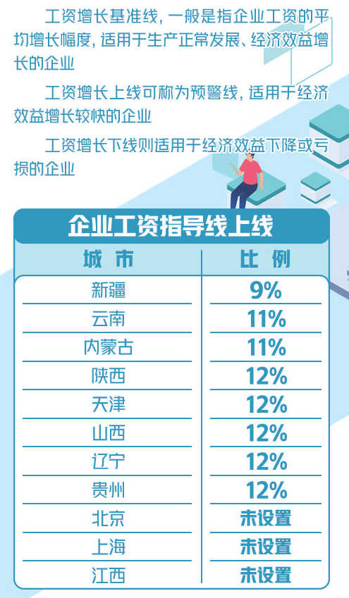 值得注意的是,部分行业的企业工资指导线有所不同。比如,天津市企业货币工资增长基准线按行业划分分别为:建筑业6.6%,批发和零售业7.7%,交通运输、仓储和邮政业6.6%,住宿和餐饮业7.7%,租赁和商务服务业8.6%,水利、环境和公共设施管理业7.4%,居民服务、修理和其他服务业7.7%;上述行业的企业货币工资增长上线、下线分别为12%、3%。