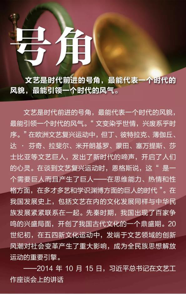 2014年10月15日,习近平主持召开文艺工作座谈会并发表重要讲话。谈及我国文艺繁荣发展的5个问题,强调实现中华民族伟大复兴需要中华文化繁荣兴盛,创作无愧于时代的优秀作品,坚持以人民为中心的创作导向,中国精神是社会主义文艺的灵魂,加强和改进党对文艺工作的领导 。