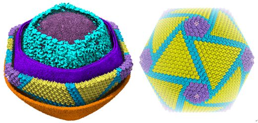 非洲猪瘟病毒整体结构(左:5层切面图;右:衣壳层整体结构)