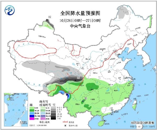 明天,内蒙古中东部、青海中东部、西藏东部、西北地区东南部、西南地区北部等地有小到中雪或雨夹雪,其中,甘肃南部等地部分地区有大雪(5~6毫米)。江汉南部、江南大部、西南地区大部、华南大部等地有小到中雨,其中,湖南西部、云南西部等地部分地区有大雨(25~45毫米)。
