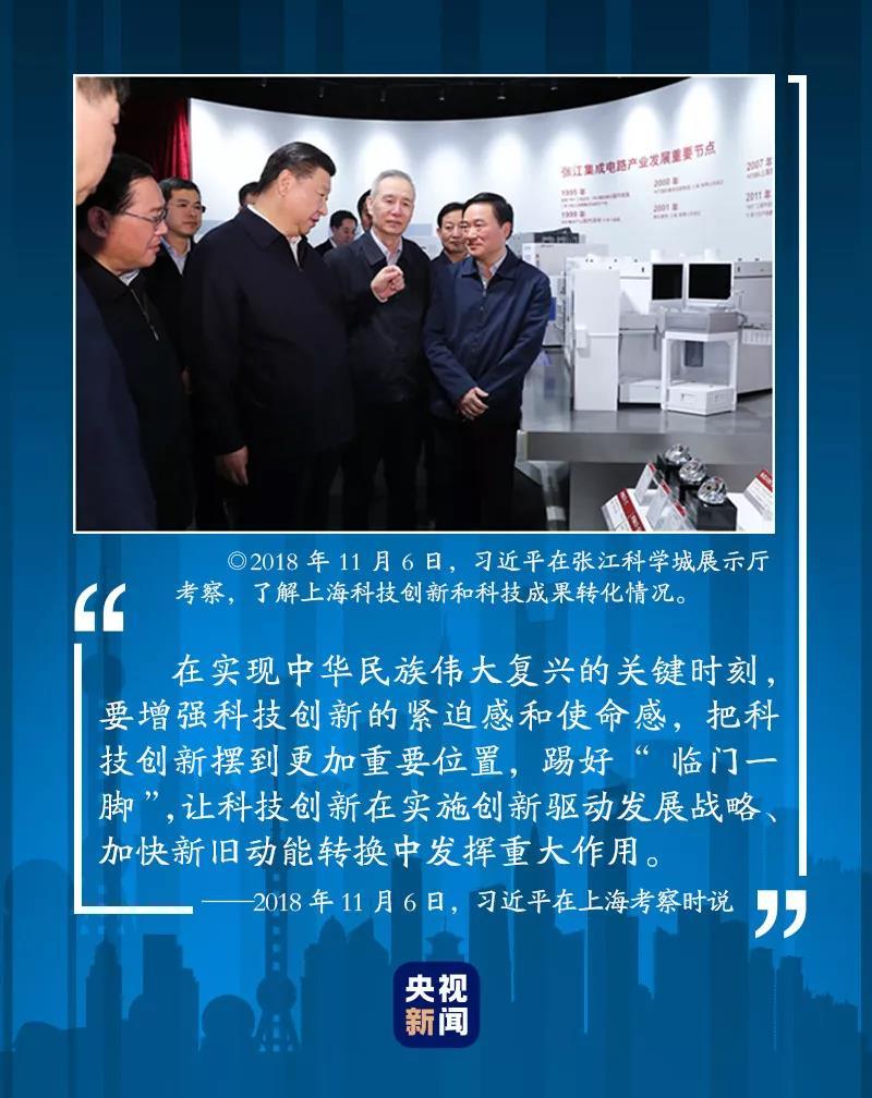 2018年11月6日下午,习近平在张江科学城展示厅考察,了解上海科技创新和科技成果转化情况。张江科学城作为上海科创中心核心区和国家级科技高地,集聚了一批大科学设施、科学平台和一流创新型院所。在这里,习近平强调了科技创新对于实现中华民族伟大复兴的重要作用。