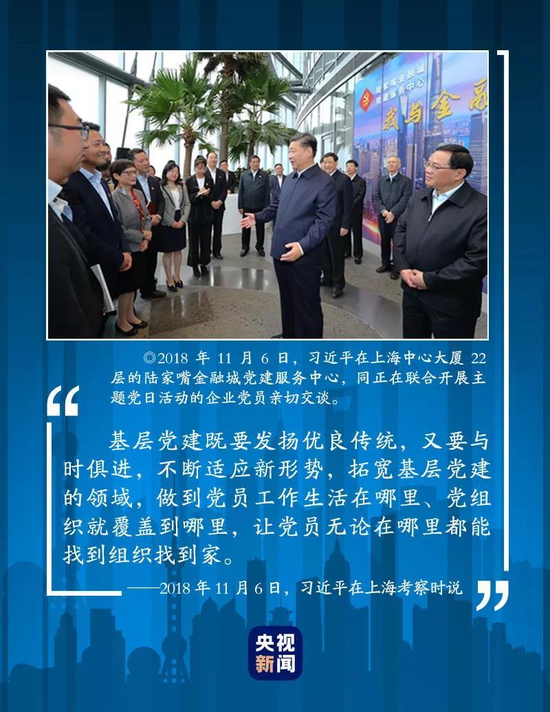 2018年11月6日上午,来到这里考察的习近平总书记充分肯定上海从陆家嘴金融城产业集聚、企业汇聚、人才广聚的实际出发,创新党建工作思路和模式,为楼宇内各种所有制企业的基层党组织和党员提供学习指导、管理服务、活动平台的做法。