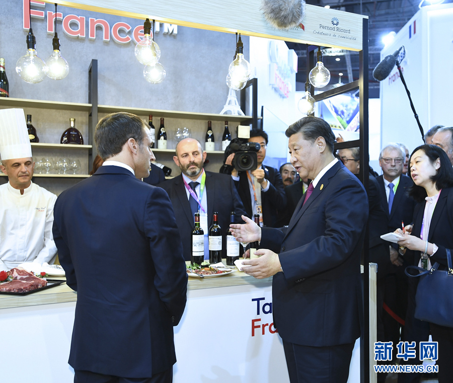 习近平在法国总统马克龙陪同下首先来到法国馆。马克龙热情邀请习近平品尝法国红酒和牛肉食品。在场法国企业家争先恐后向习近平表示,法国企业看好中国市场,希望进一步扩大对华出口。习近平指出,中国消费市场很大,可以满足不同层次的多样化需求,希望法国企业家展现长远眼光,同中国加强互利合作。