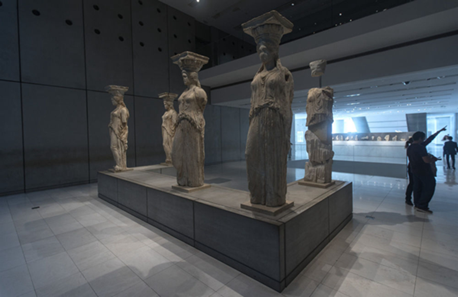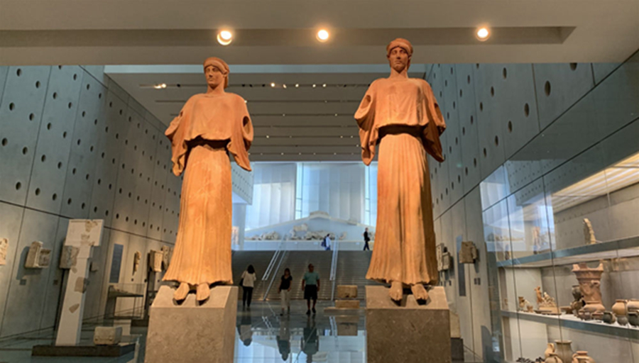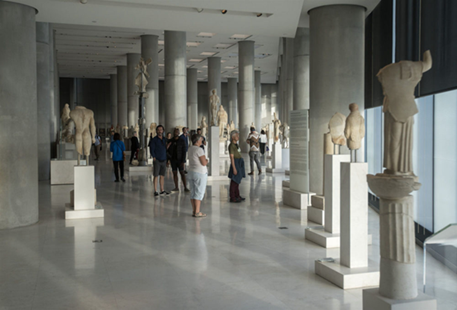 地中海温暖的阳光透过雅典卫城博物馆玻璃幕墙洒入展厅,一座座古希腊神话人物和建筑雕像栩栩如生,展示着美和力量,诉说着希腊古典艺术的灿烂辉煌,令人仿佛徜徉于历史长河里,沉醉在文明画卷中。