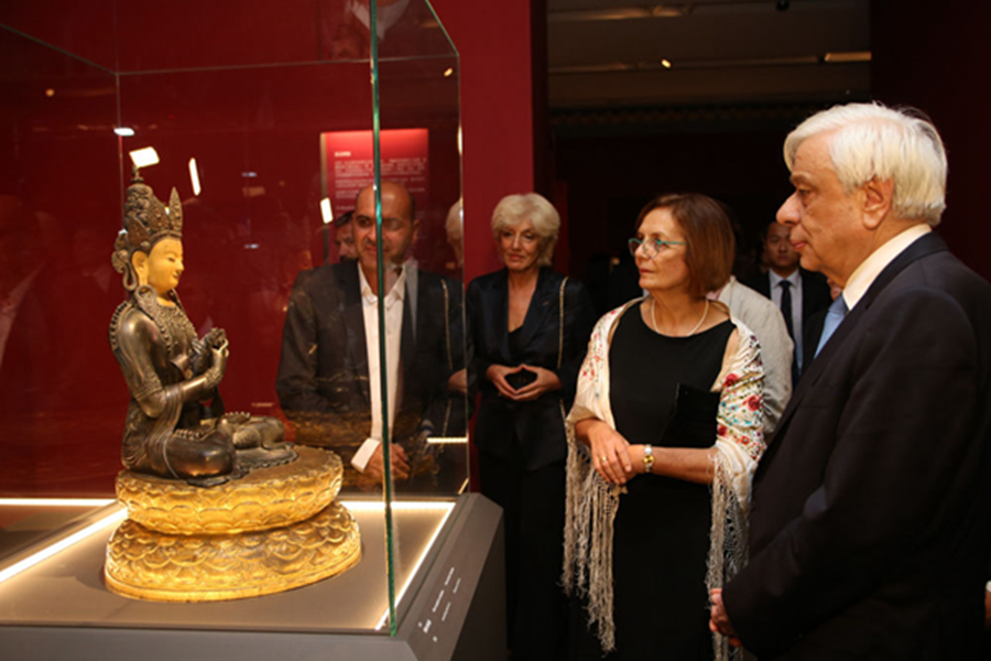 2018年9月14日,在希腊首都雅典卫城博物馆,希腊总统帕夫洛普洛斯(右)在“重文德之光华:重华宫原状文物展”上参观。这是来自中国故宫博物院的154件清朝乾隆时期珍贵文物首次出国展出。新华社发(马里奥斯·罗洛斯摄)