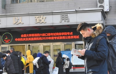昨日,北京联合大学商务学院,参加国考的考生进场前还在复习。新京报记者 陶冉 摄