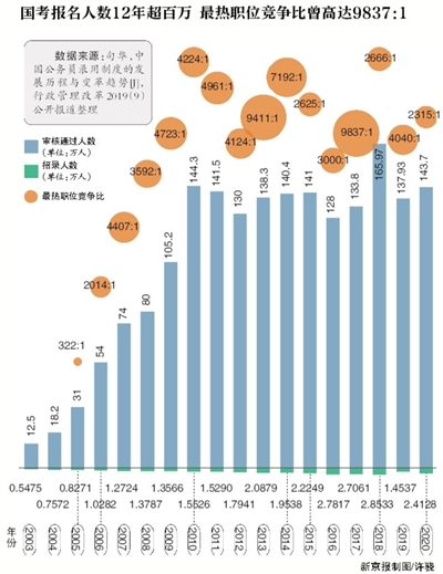 143万人角逐国家公务员1.38万职位,最热职位竞争比2315:1,明年1月可查笔试成绩和最低分数线