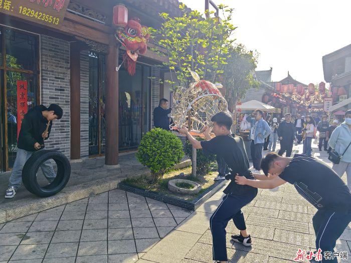 在天水古城,记者看到有三位年轻人正在练习舞狮,他们拿着简易的狮头,用一个轮胎圈当鼓,虽然道具特别简单,但他们训练得非常卖力,吸引了不少游客驻足观赏,为他们鼓掌。