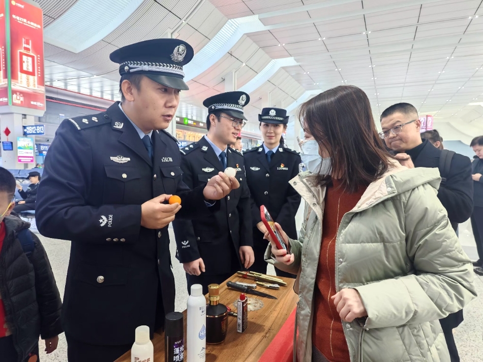 “乘客们需尤其注意管制器具与爆炸类物品如厨用刀具、弹簧折叠刀、烟花、鞭炮等春节期间的常见违禁物。除了锋利的刀具、钝器外,自热食品、两个以上的打火机、超过150毫升的发胶、空气清新剂等日常生活用品也在禁止和限制携带范围内。”兰州铁路公安局民警蔚超正在向过往乘客介绍禁止、限制携带和托运物品清单并发放宣传手册。