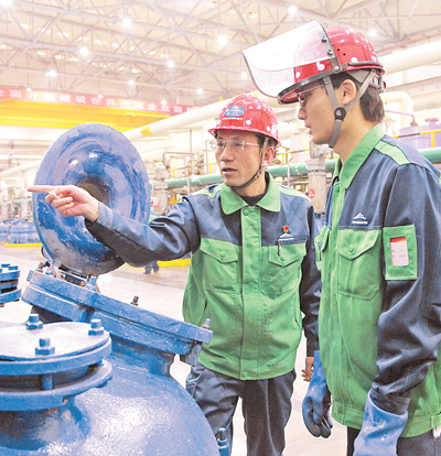 潘从明(左)在指导班组成员操作设备。 本报记者 赵帅杰摄 |