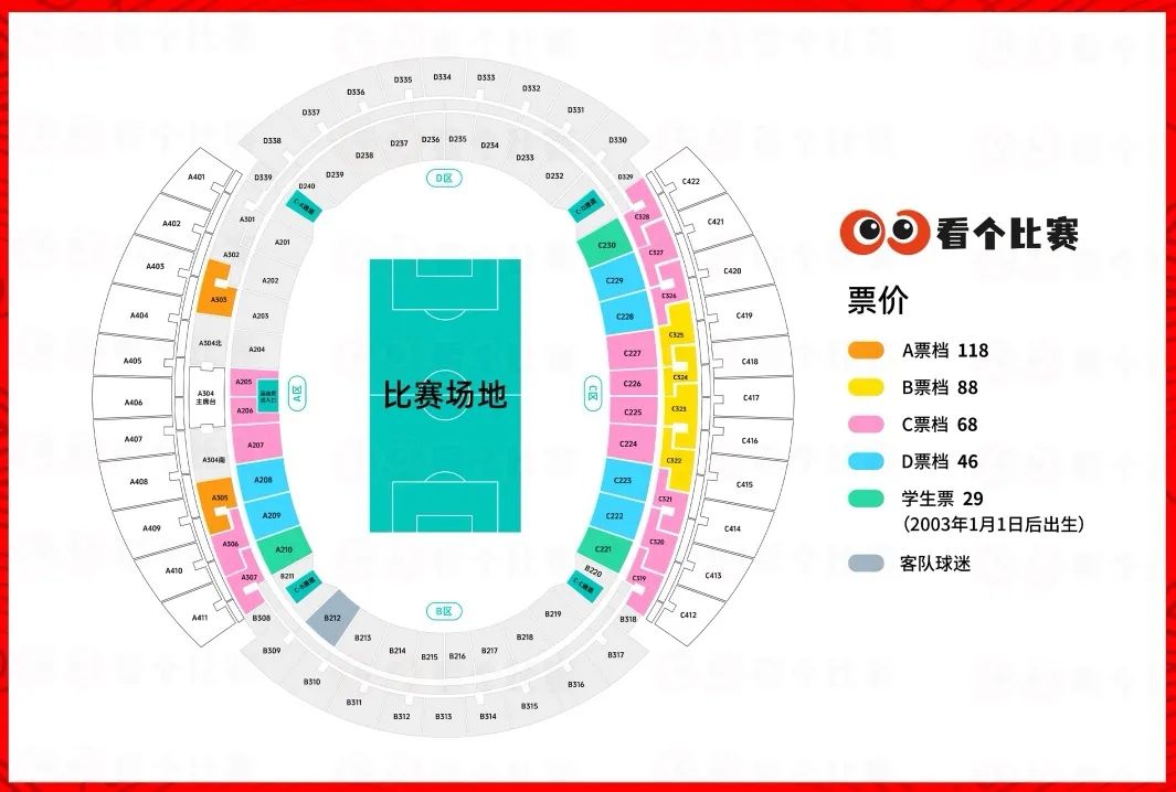 兰州陇原竞技俱乐部最新票务公告显示,本场比赛球票以线上形式在“看个比赛”平台销售,票价分A、B、C、D四个档,依次为118元、88元、68元和46元,学生票统一为29元,所有球票同步开售,数量有限,售完即止。另外,作为兰州陇原竞技的主场,兰州奥体中心也有一定数量的球票同步开售(包括68元和46元两个档)。