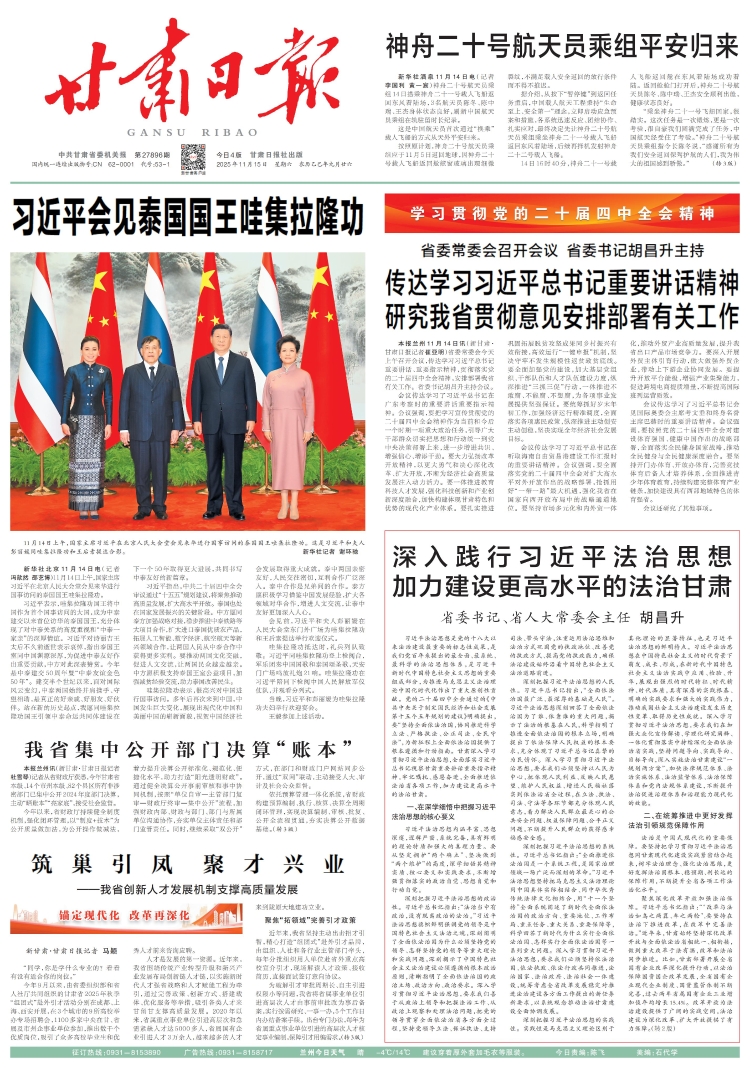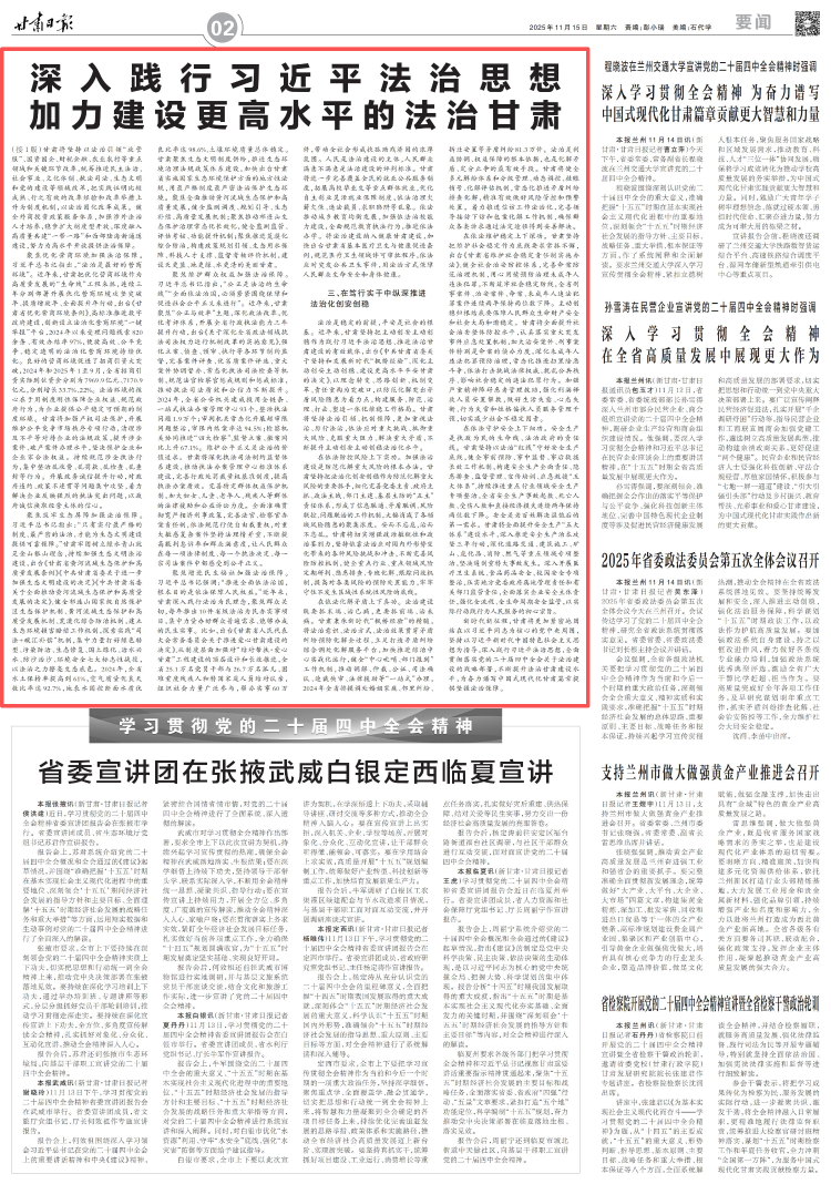 新时代新征程,甘肃将更加紧密地团结在以习近平同志为核心的党中央周围,坚持以习近平新时代中国特色社会主义思想为指导,深入践行习近平法治思想,全面贯彻落实党的二十届四中全会关于法治建设的战略部署,不断提升法治甘肃建设水平,为奋力谱写中国式现代化甘肃篇章提供坚强法治保障。