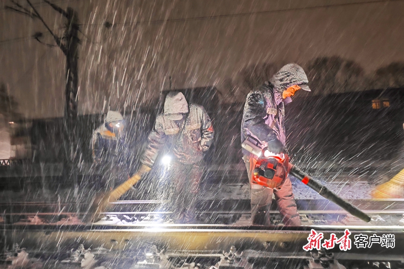 兰州铁路局工作人员清理线路积雪。
