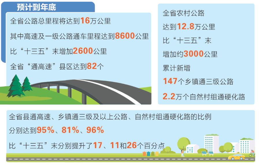 “十四五”以来,全省交通基础设施网络持续完善,交通基础设施建设取得新成效。预计到年底,全省公路总里程将达到16万公里,其中高速及一级公路通车里程达到8600公里,比“十三五”末增加2600公里,累计新增15个县“通高速”,全省“通高速”县区达到82个;全省农村公路达到12.8万公里,比“十三五”末增加约3000公里,累计新增147个乡镇通三级公路、2.2万个自然村组通硬化路。全省县通高速、乡镇通三级及以上公路、自然村组通硬化路的比例分别达到95%、81%、96%,比“十三五”末分别提升了17、11和26个百分点。