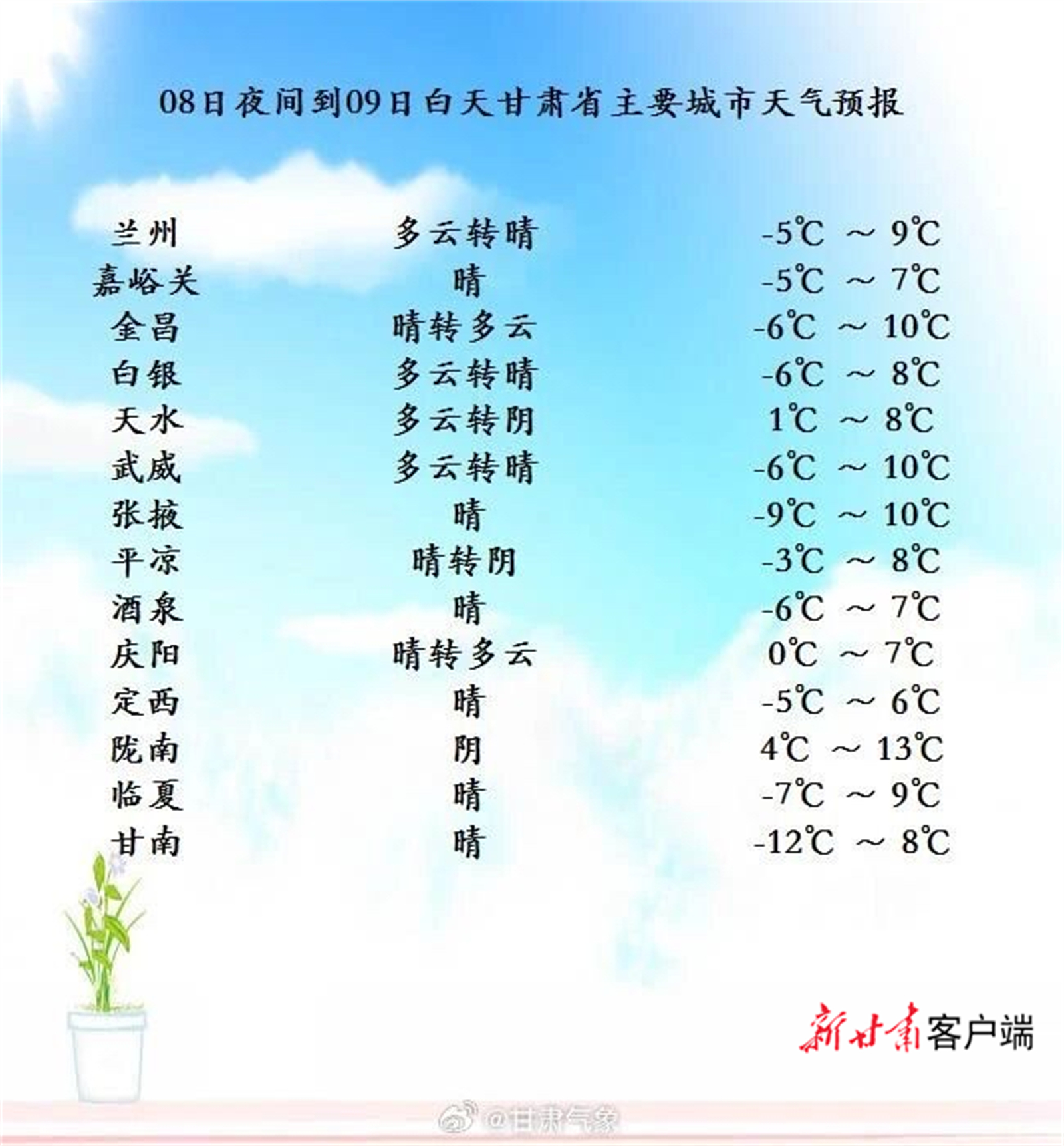12月8日夜间到9日白天,甘南、陇南、天水三州市多云,局部地方阴有小雪(雨);省内其余地方晴或多云。另外,酒泉市有4至5级西北风。