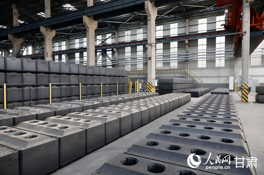 陇西索通炭材料有限公司生产车间铝用炭材料整齐陈列。人民网记者 焦隆摄