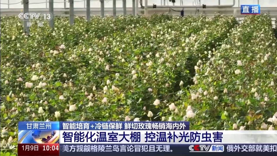 总台记者 崔林欣:在甘肃省兰州新区现代农业示范园花卉产业基地,在我的身旁有一些不同品种的玫瑰花已经开放,各式各样盛放的玫瑰,让整座温室大棚显得非常壮观。兰州新区的花卉智能温室是目前西北地区最大的鲜切玫瑰繁育基地。