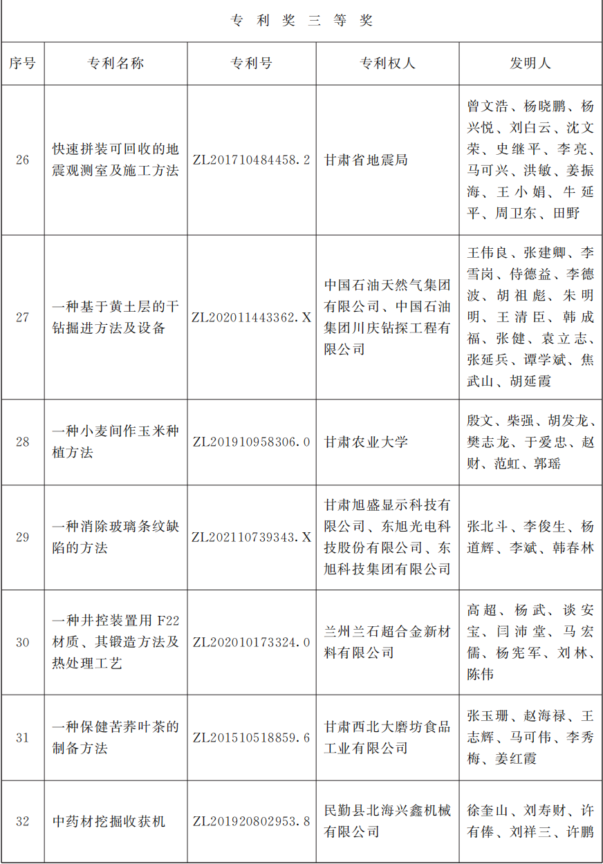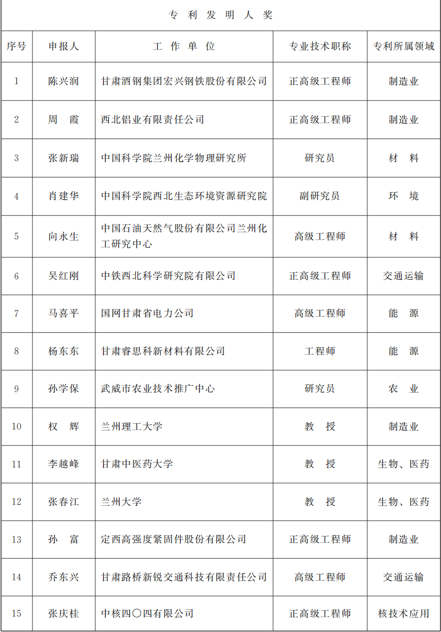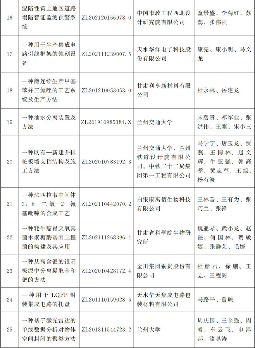 2025年度甘肃省专利奖励名单
