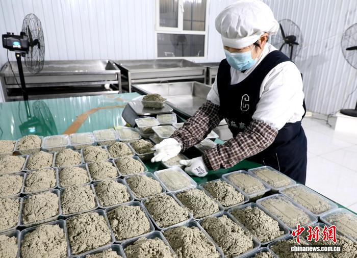 2月2日,甘肃省武威市民勤县手工麻腐工坊手艺人,为直播平台下单客户赶制麻腐。 徐洁 摄