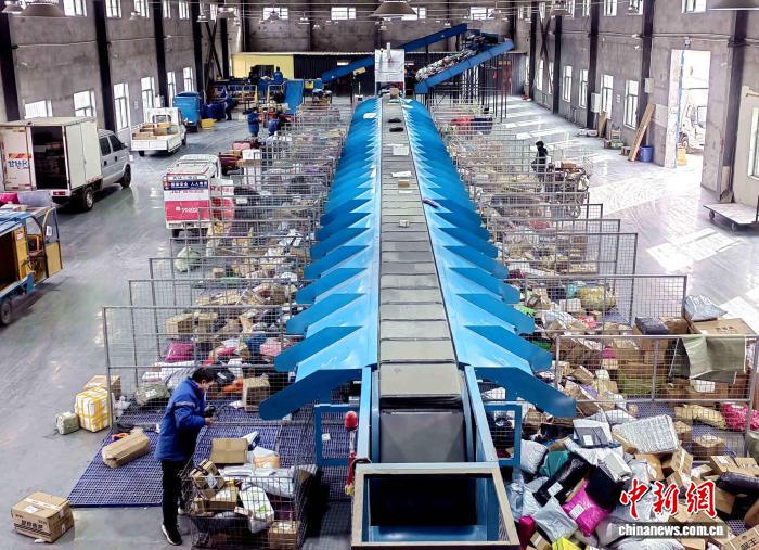 民勤电商物流产业园内, 特色年货快件高效集散,实现双向畅通。(资料图)荣小勤 摄