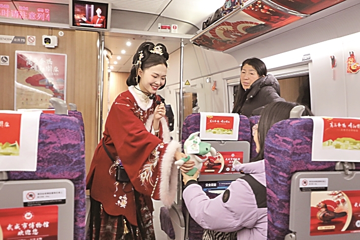 2月9日,在G848次列车上,武威市博物馆工作人员向旅客赠送文创礼品。新华社发