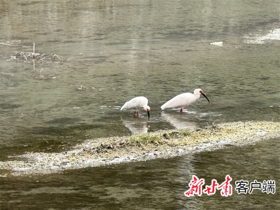 朱鹮现身于康县云台河畔。新甘肃·甘肃日报通讯员 李平摄