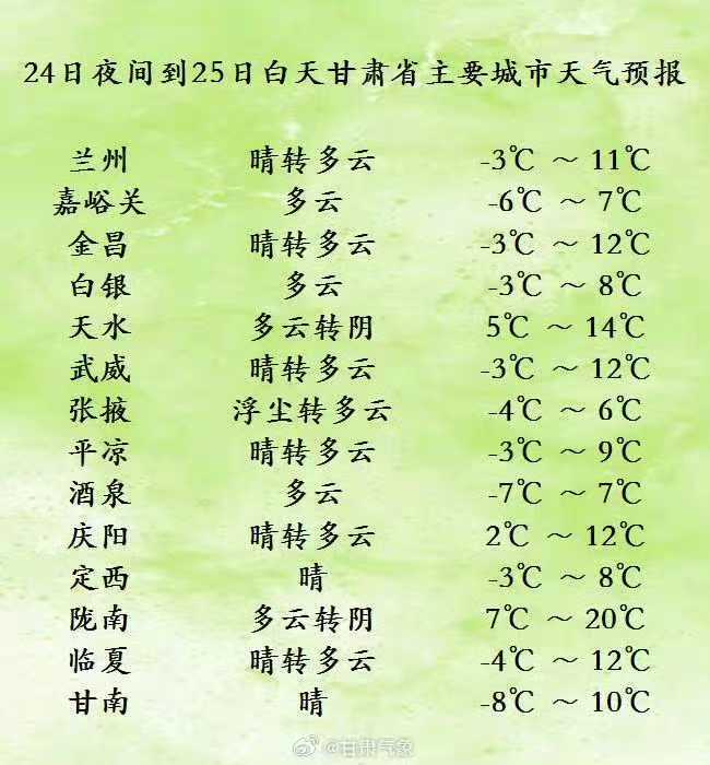 明天夜间到后天白天(2月25日20时—2月26日20时)全省各地晴或多云,其中酒泉、张掖两市局部地方阴有小雪。