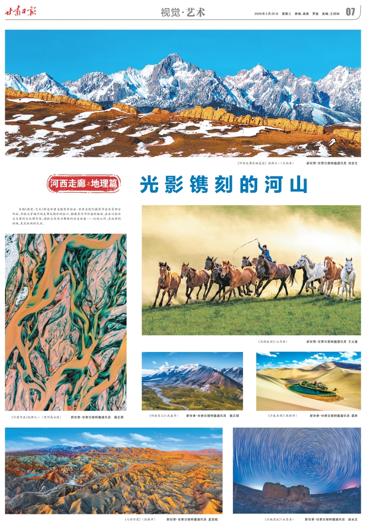 本期《视觉·艺术》辑选甘肃省摄影家协会、甘肃省现代摄影学会会员部分作品,用镜头穿越河西走廊乌鞘岭的隘口,触摸黑河冲积扇的脉动,在冰川融水与戈壁的生死博弈间,捕捉自然伟力雕琢的壮美画卷——此间山河,是地理的剖面,更是时间的化石。新甘肃·甘肃日报记者 高樯组稿