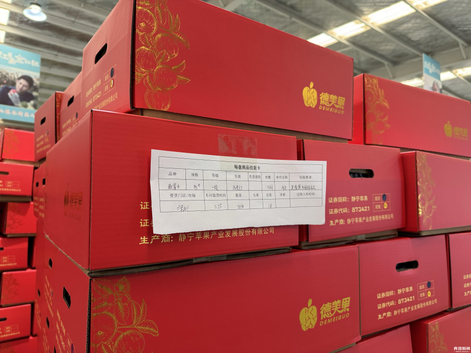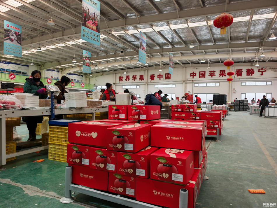 交谈间,车间里响起机器的轰鸣声,叉车将分装好的苹果箱送往装车区。女工们说说笑笑,手上的活计一点儿也不慢。箱子上“静宁苹果”四个字在灯光下格外醒目。
