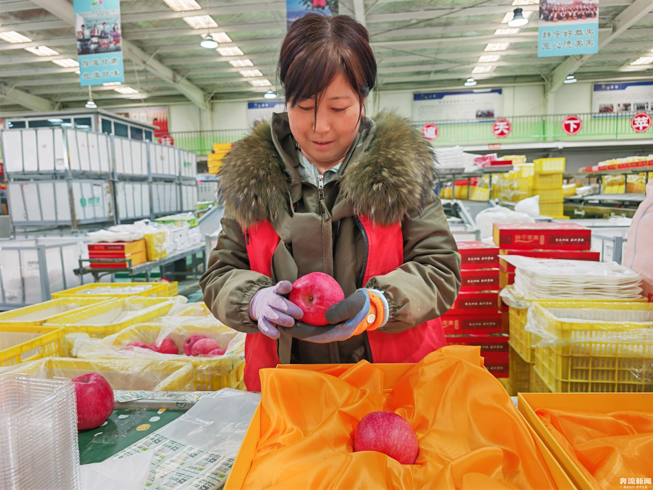 2月25日上午,苹果分拣车间,浓郁的果香扑面而来。偌大的车间里,30多名女工正围坐在小山似的苹果堆旁,麻利地分拣、套袋、装箱。“这些苹果是机器分拣过的,但装箱前我们还得再过一遍。”张莺莺边对记者说边拿起一个红彤彤的苹果套上网套,轻轻放进身旁的纸箱里。她动作娴熟,一整套流程下来不过十几秒。