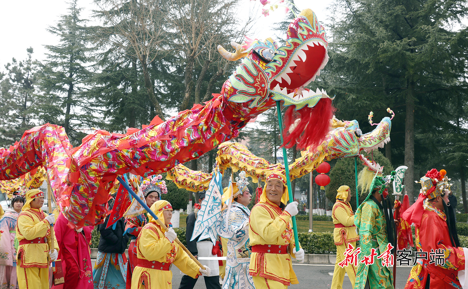 2月24日,安定区的社火队在城区走街串巷,为群众表演舞龙、舞狮、踩高跷等传统社火节目,在欢乐中迎接元宵佳节。新甘肃·甘肃日报通讯员 王克贤