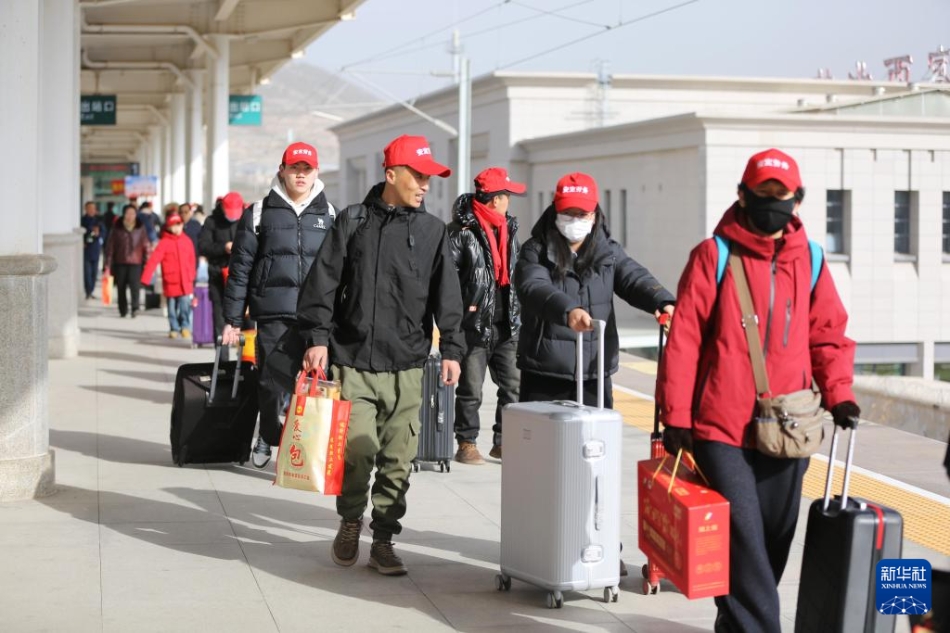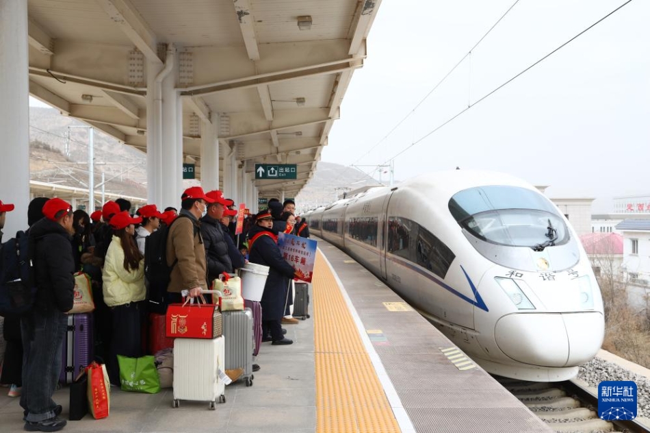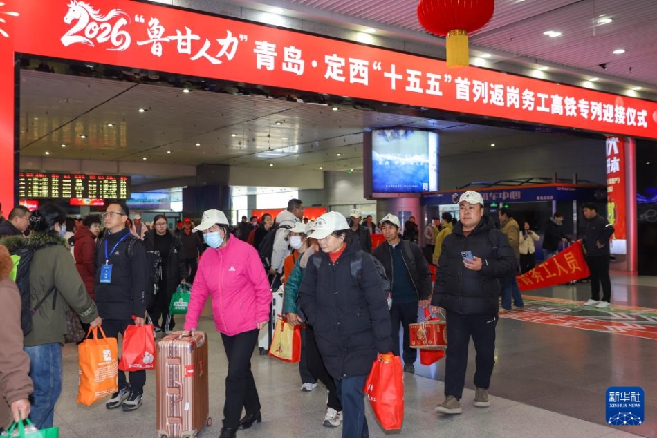 2月25日,来自甘肃省定西市的500余名务工人员,搭乘G2096次高铁务工专列前往山东省青岛市。据悉,今年是“鲁甘人力”协作机制下连续第六年开行“点对点”免费返岗务工专列,这是甘肃省春节后开行的首趟返岗务工专列。