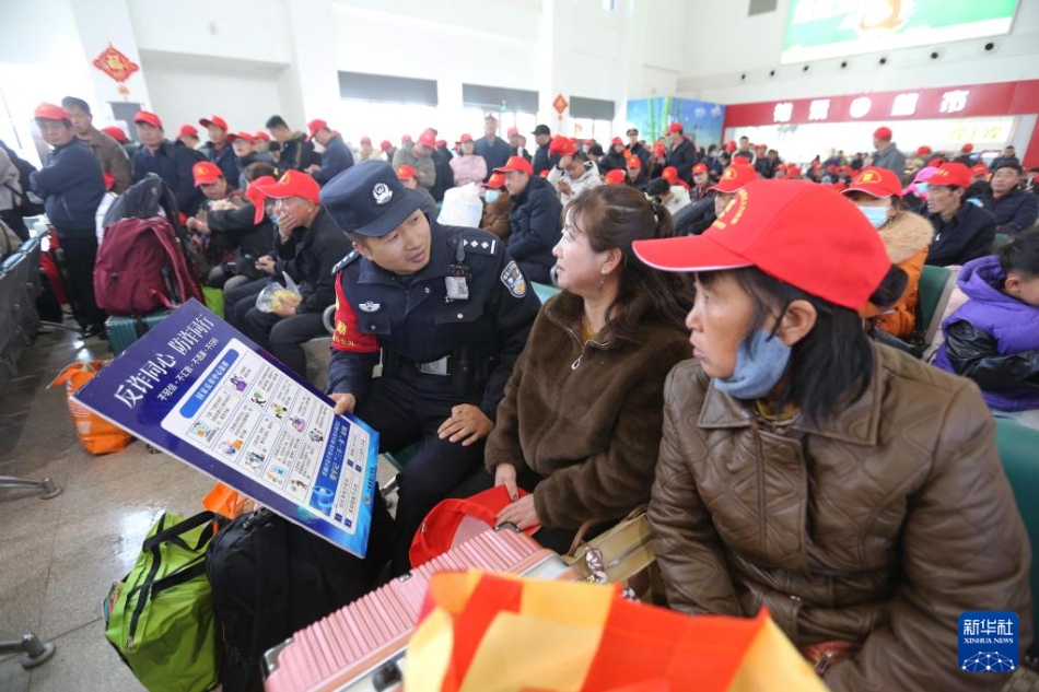 2月25日,铁路民警在甘肃定西北站向返岗务工人员宣传反诈知识。新华社发(王克贤 摄)