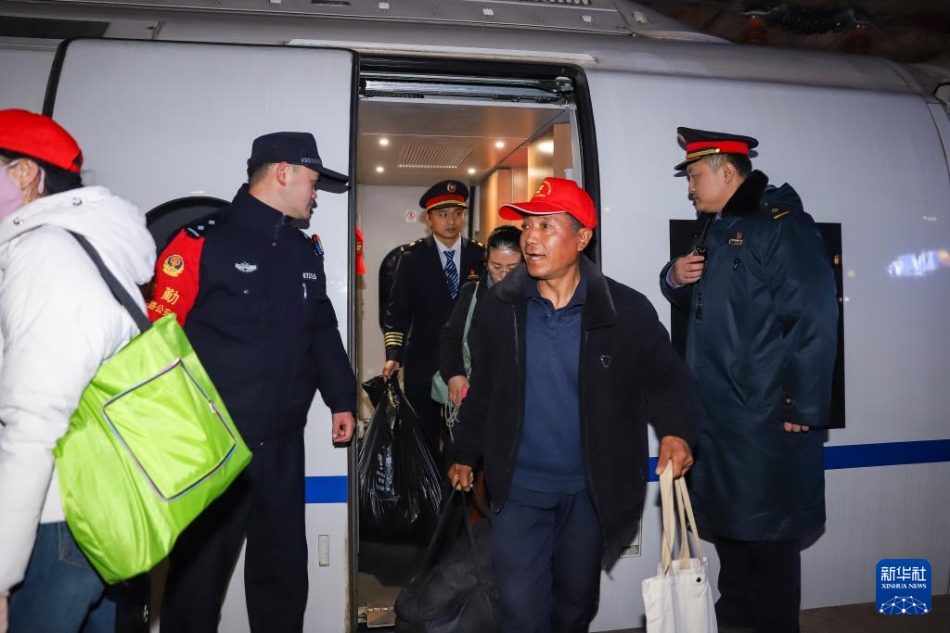 2月25日,来自甘肃的务工人员乘坐G2096次高铁列车抵达青岛北站。新华社发(张鹰 摄)