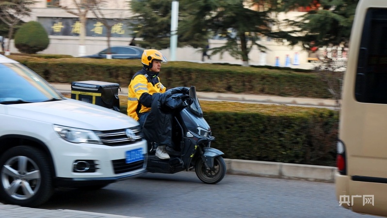 美团外卖骑手正在城市中穿搜(央广网记者 魏晋雪 摄)
