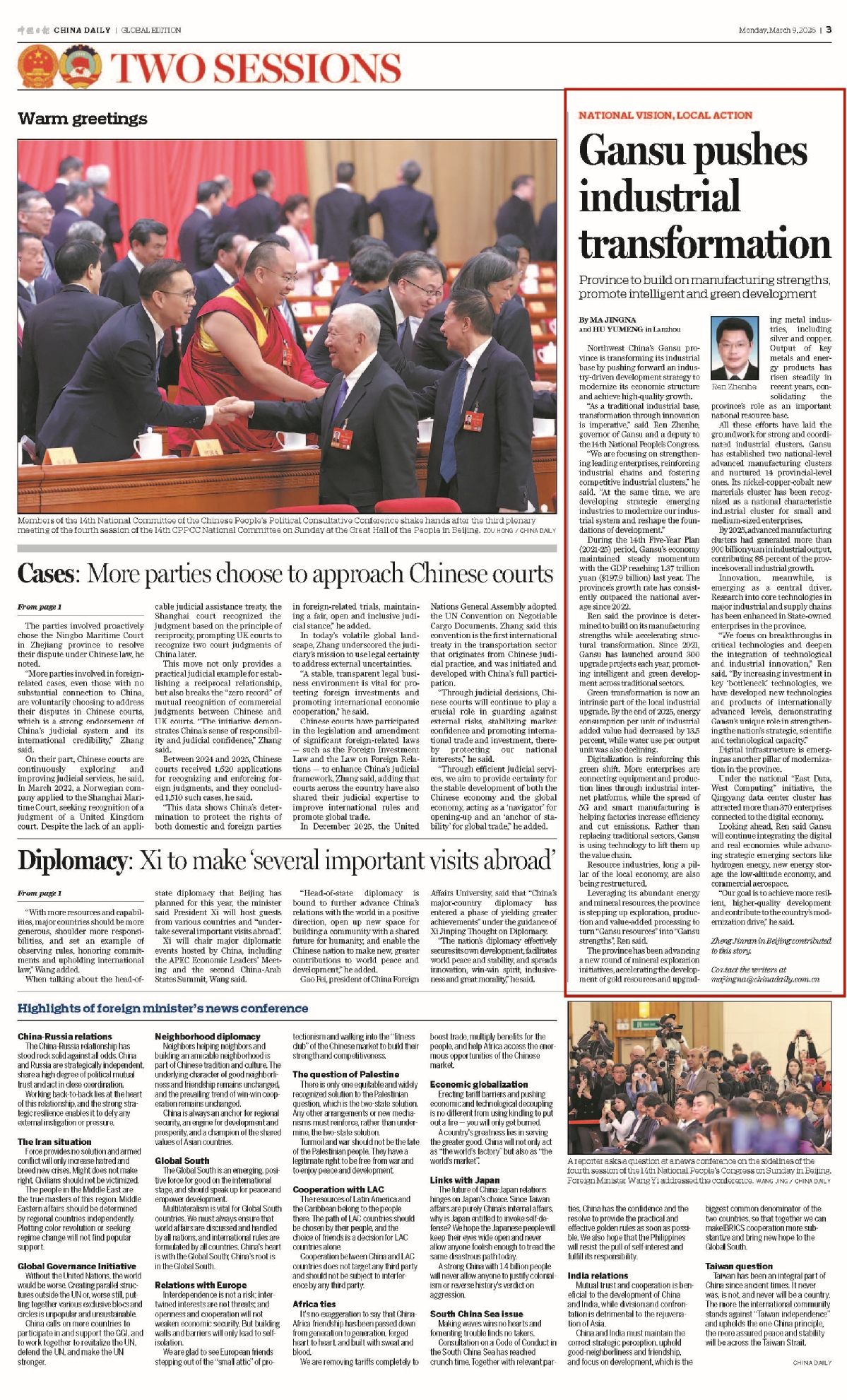 今天,《中国日报》头版推出“中国式现代化的地方实践”(National Vision,Local Action)高端访谈栏目——全国人大代表、甘肃省省长任振鹤专访报道Gansu advances industrial upgrade to bolster growth(《甘肃加快产业转型 夯实发展动能》)。