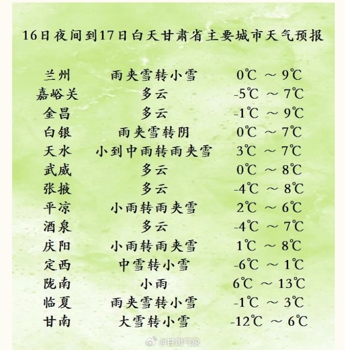 3月16日夜间到17日白天,甘南,临夏,定西三州市及天水西部阴有小到中雪,其中甘南东部,临夏南部,定西西部和南部有大雪;陇南,平凉,兰州三市及天水中东部,庆阳南部,白银南部多云转阴有小雨(雪)或雨夹雪,局部地方有中雪;省内其余地方多云,祁连山区阴有小雪。另外,酒泉市有4至5级偏东风,武威,白银,兰州东部,庆阳北部有4至5级偏北风,上述地方伴有扬沙或浮尘。