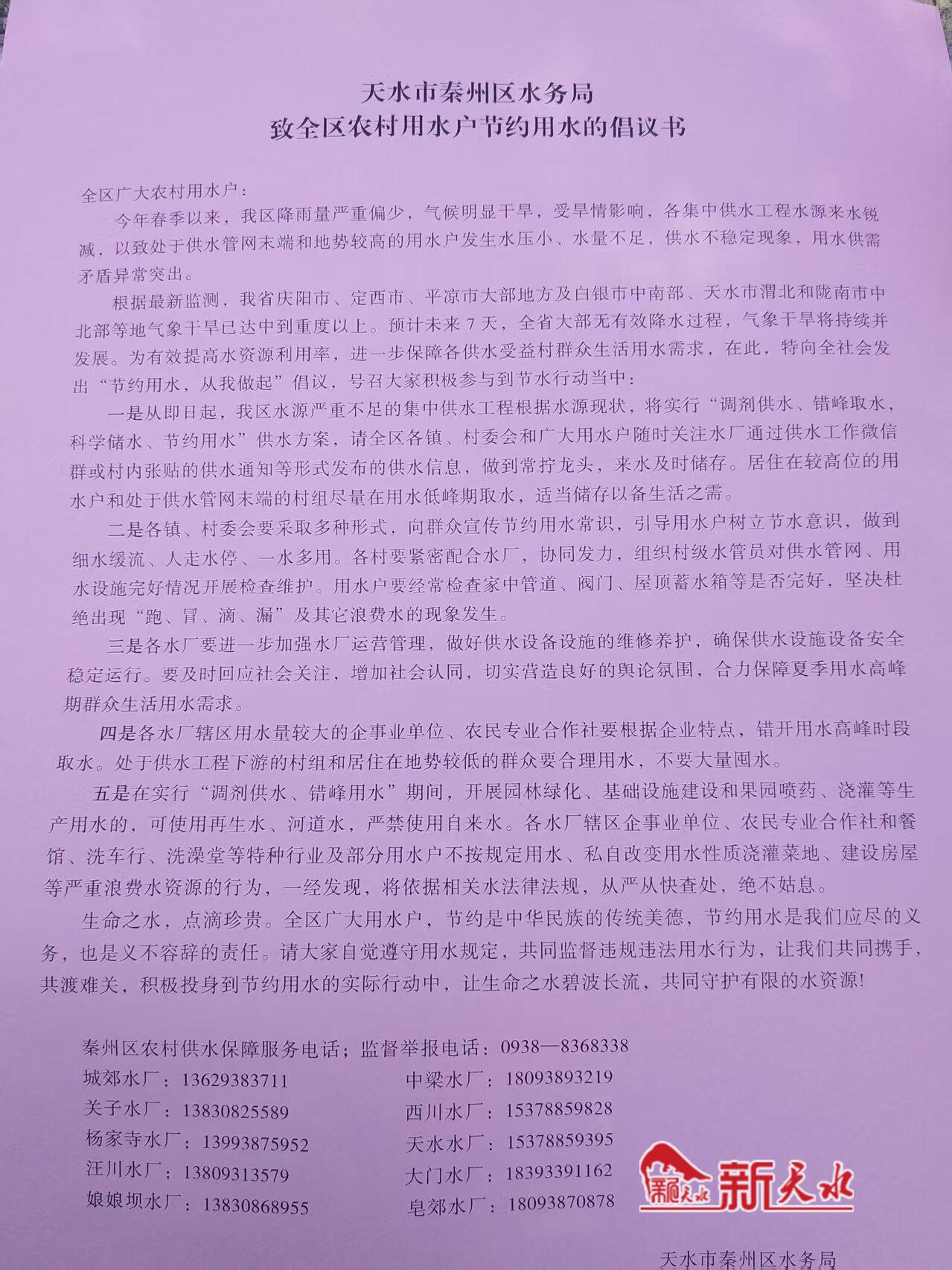 区水务局发出《致全区农村用水户节约用水共渡难关的倡议书》以来,各镇已将相关通知及错峰调剂供水的消息通过各村供水微信群进行了多次发布,并在镇上、村里进行了张贴告知,个别村民尤其是老年人没进群或者没仔细看,会误以为是供水站停水。供水站将和各镇、村委会采取多种形式向群众进行广泛宣传,提示蓄水,加强节约用水意识,做到细水缓流、人走水停、一水多用。同时为切实保障广大群众的基本生活饮用供水,要求用水量较大的企事业单位、农民专业合作社错开用水高峰时段取水,处于供水工程下游的村组和居住在地势较低的群众要合理用水,不要大量囤水。开展园林绿化、基础设施建设和果园喷药、浇灌等生产用水的,可使用再生水、河道水,严禁使用自来水。