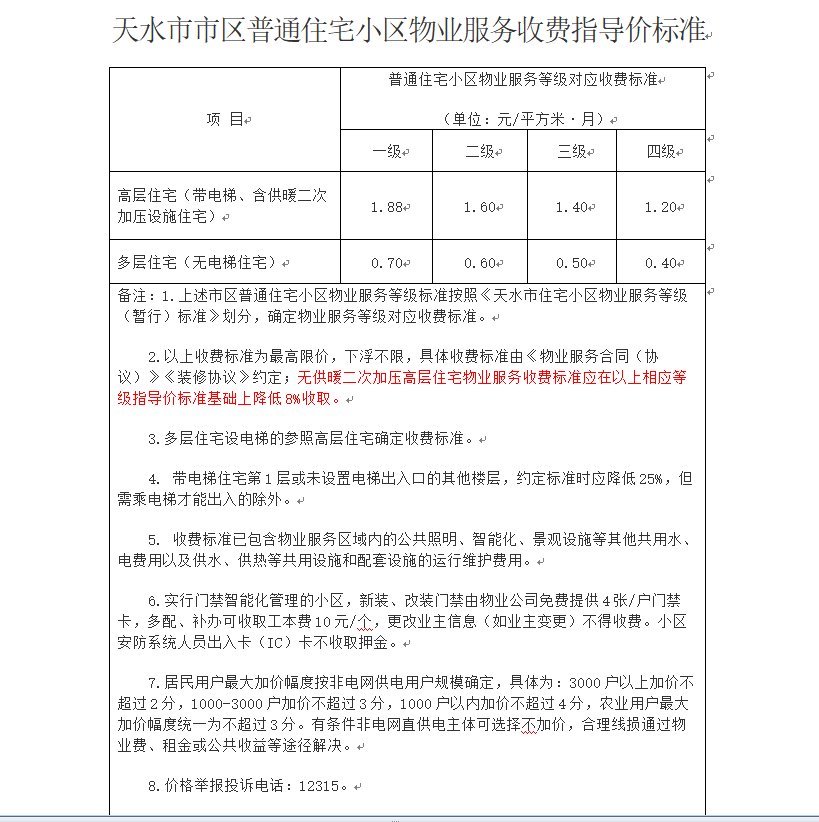 上述《通知》公布了《天水市市区普通住宅小区物业服务收费指导价标准》,如下: