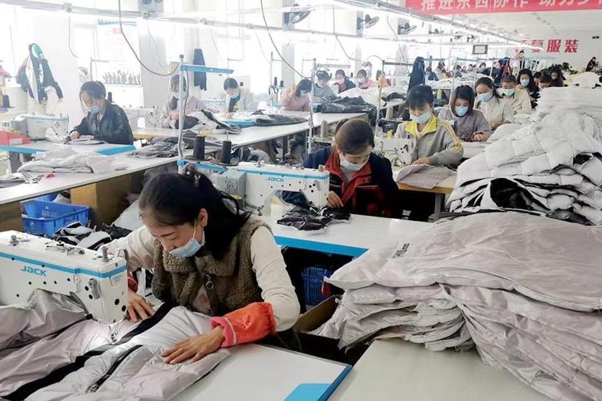 清水县城的轩蔓服装有限公司就业帮扶车间内,缝纫机声“嗒嗒”作响,“能工巧妇”们正熟练地制作着棉衣、校服等产品。