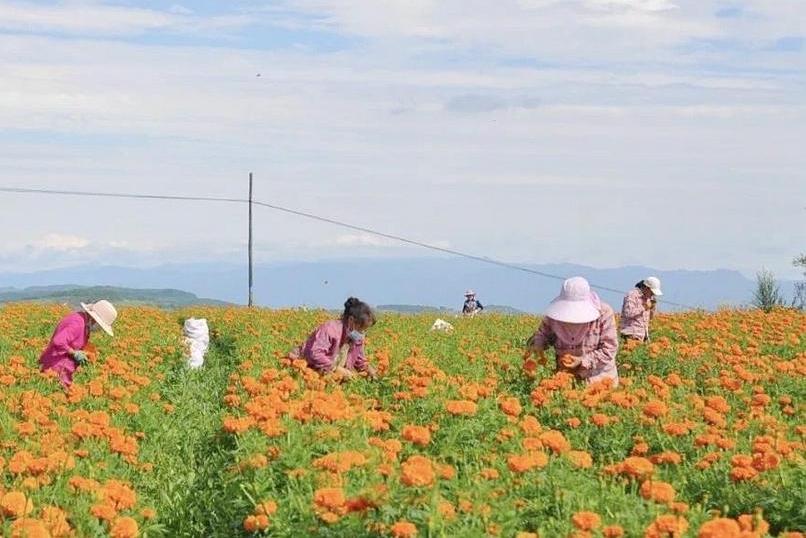秋风起,丰收忙。地里的玉米熟了,连片万寿菊竞相绽放,果园中苹果挂满枝头……