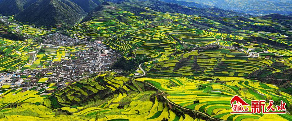 五一前夕,空中俯瞰武山县大片金灿灿的油菜花竞相绽放,遍地金黄的油菜花遍布山野,透露着勃勃生机。