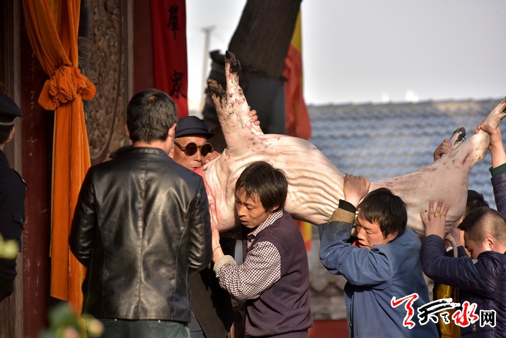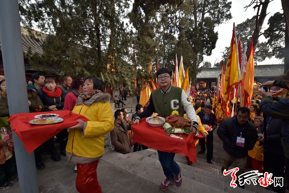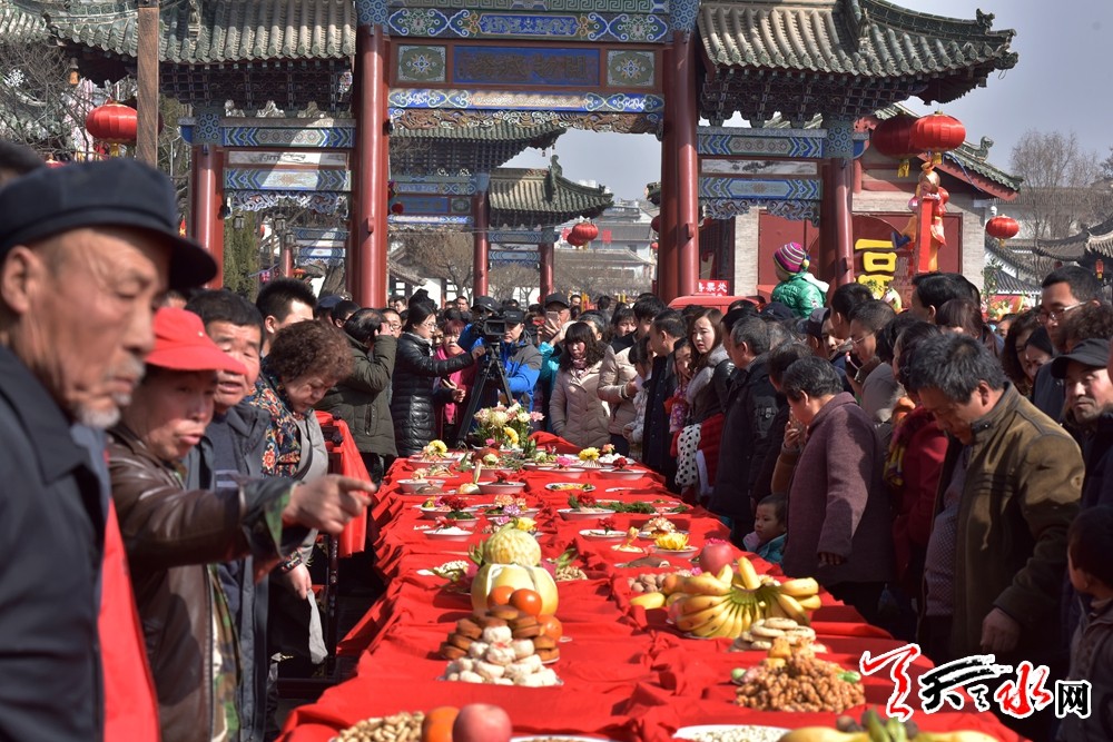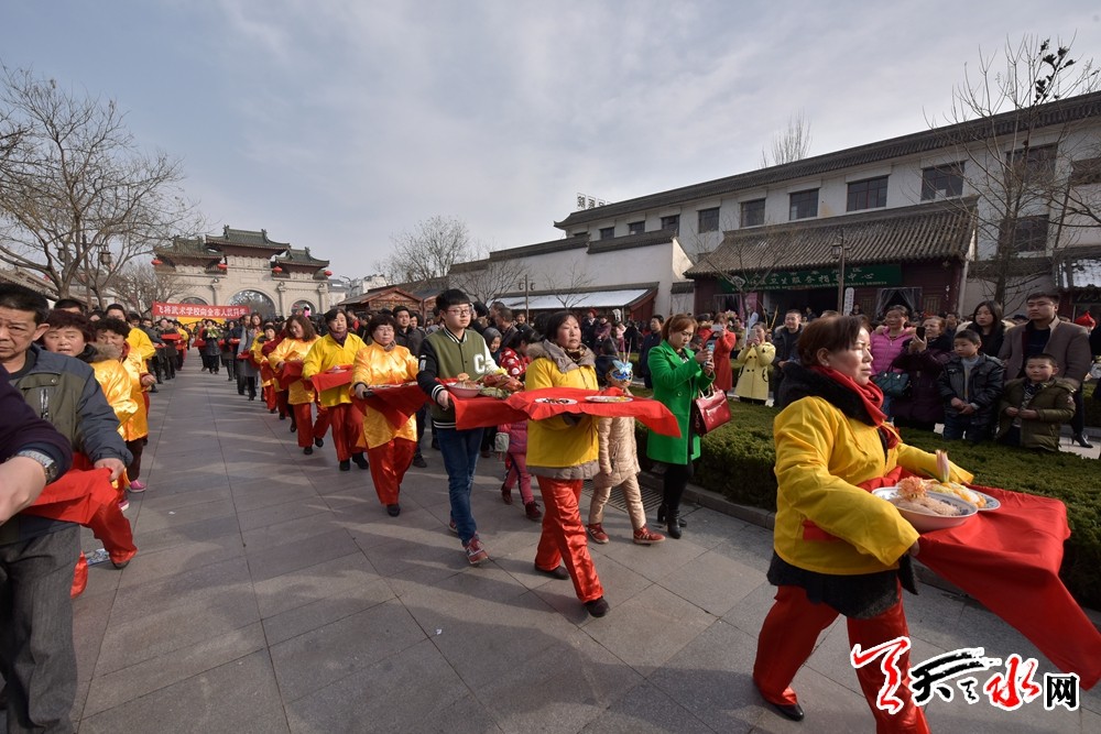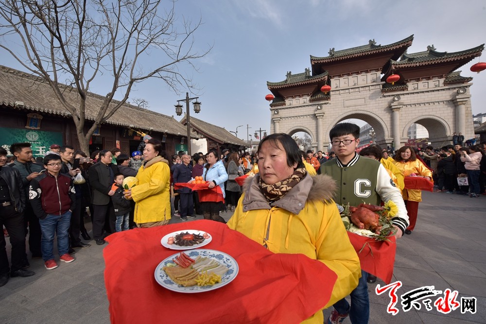 当日,春祭伏羲活动迎来迎献饭仪式,迎献饭是祭祀仪式正式开始之前的一项重要活动。献饭由上元会事先准备,正月十五日下午,身着朝冠礼服的专职祭祀生员抬上装有献饭的食盒在彩旗队的护送和唢呐队吹吹打打的相伴助威下,绕伏羲庙前一周,然后将献饭迎接入庙,摆放在月台东侧的供桌,以备仪式开始后献供。迎献饭的队伍一路开来,浩浩荡荡、热闹非凡。献饭的种类也很多,主要有“太牢,即牛头、羊头和猪头,还有各式各样的荤素盘子、三鲜、主食和清酒。