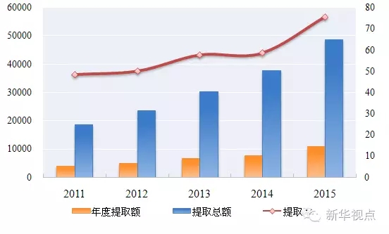 “十二五”期间,住房公积金提取额34059.53亿元,年均增长29.32%。