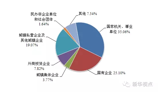 缴存职工中,国家机关和事业单位职工占35.06%,国有企业职工占25.10%,城镇集体企业职工占3.77%,外商投资企业职工占7.82%,城镇私营企业及其他城镇企业职工占19.07%,民办非企业单位和社会团体职工占1.64%,其他占7.54%。