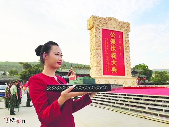 “虽然很累,但是站在这里,端起祭祀托盘的这一刻,我感觉到很神圣。”6月17日上午,记者见到担任2016(丙申)年公祭伏羲大典的首席礼仪王姜乐时,她正在伏羲庙广场排练。