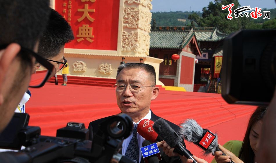 天天天水网讯【记者郝勤学】6月22日上午,2016(丙申)年公祭伏羲大典开始之前,市委书记王锐就公祭伏羲大典事宜接受了现场中央电视台、甘肃卫视、甘肃人民广播电台、人民网、新华网、中新网、《天水日报》、天水电视台等多家中央、省、市媒体的联合采访。
